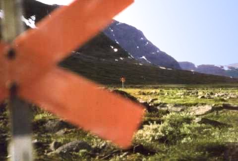 Rote Andreaskreuze kennzeichnen den Winterwanderweg, der auf großen Teilen parallel zum Kungsleden vrläuft.